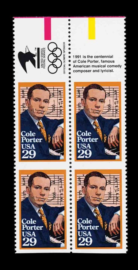 790 nhbl 2550a #2550a, 29c Cole Porter, imperforate horizontally, top imprint margin block of four containing two error pairs, very fresh, o.g., n.h., extremely fine. (Image) 1,300.00+