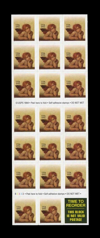 793 nhBP 2595d image#2595d, 29c Eagle and Shield, booklet pane of seventeen, no die cutting, fresh unfolded pane with full backing (unlike many of the panes which are faulty or folded), extremely fine and very scarce. (Image) 1,750.00
