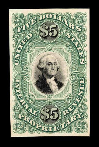1176 P RB10P2 #RB10P2, $5.00 Green and black, small die proof an impressive and exceptionally rare proof of this large size revenue, measuring 65x108mm, large even margins on all sides, colors are strong and bright, couple of trivial thin specks as would be expected on a proof of this size, and totally insignificant considering the rarity of this die proof, this is the only example that was offered in the famous Morton Dean Joyce sale and may well be unique, extremely fine; ex-Joyce. (Image) 2,000.00