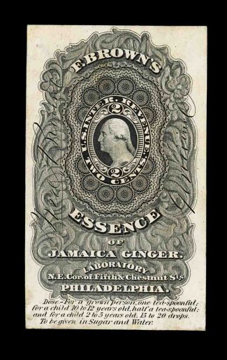 1231 O RP1 image#RP1, Kensett, T. & Co., 1c Green, the only private die revenue issued for canned fruit, fresh deep color, couple of tiny stain spots that nearly all of this issue seem to have and faint vertical crease at bottom, fine and rare stamp. (Image) 1,000.00