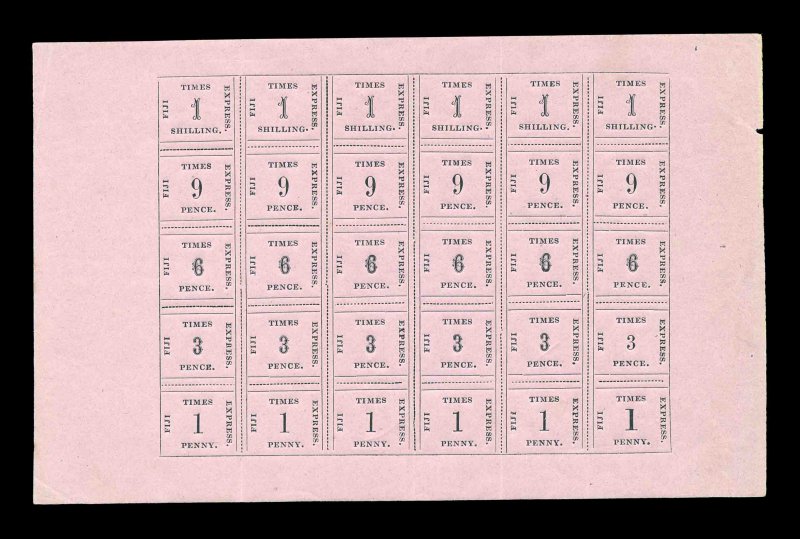 1439 1888 1p-1/- "Fiji Times Express" Second Imitations cplt. in a full sheet of 30, this imitation was first noted in 1888 and was issued some time between 1876 and 1888, in terms of appearance the individual stamps are more generally like the issued stamps but the sheet configuration is entirely different, the sheet consists of six vertical rows containing the five values with the 1/- value at top and the other values in descending order to the 1p at bottom, color is a strong lilac rose color on thicker wove paper, an interesting feature of this imitation is that the 1p and 3p in the right column are a different style numeral than the other five stamps of those values, this sheet has full gum as issued, h.r. in the selvage, left vertical row is nearly, but not completely, separated with hinge reinforcement, otherwise very fine; it is not likely that there are many full sheets still intact. (Image) Est. 500-750