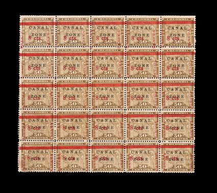 510 ogbl 19, 19d #19, 19d, "8 cts" on 50c Bister brown, mint block of 25, positions 1-5/41-45, with numerous varieties present including "Panama" reading up and down at position 1 (#19d, only 380 printed), also antique "Z" and antique "L" (positions 32, 42), several inverted "V" for "A" varieties, and other varieties of the "Panama" overprint, rich color, part tropicalized o.g., bottom left stamp with small tear, bottom right stamp with minor perf. toning, fine-very fine multiple (CZSG #19, 19d, 19.2, 19.3). (Image) 1,550.00+