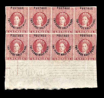 243 ogbl S.G. #22a S.G. #22a, 1881 "Two Pence Half-Penny." surcharge on Rose lake, imperforate, impressive bottom sheet-margin block of eight, clear wide margins all around, fresh with bright color, in addition the bottom left stamp shows "Pencf" surcharge variety, position R.8/12, o.g., three left stamps in the bottom row are n.h., tiny scissors cut between stamps at left and minor vertical creasing slightly affecting the variety, extremely fine appearance and a rare imperforate multiple; ex-Pilkington (Scott #9a; $1,700.00+). (Image) £1,800+