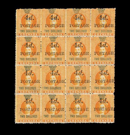 315 ogbl S.G. #41, 41b S.G. #41, 41b, 1888 "4d/Postage" provisional surcharge, 4mm spacing, on 2/- Orange revenue, mint block of sixteen, the second stamp from left in the bottom row shows the wide spacing between "Two" and "Shillings", variable centering as usual but variety in bottom row is exceptionally well centered, o.g., some gum toning that hardly shows on the front affecting variety, attractive and fine-very fine block (Scott #41, 41a, $1,075.00+). (Image) £820+
