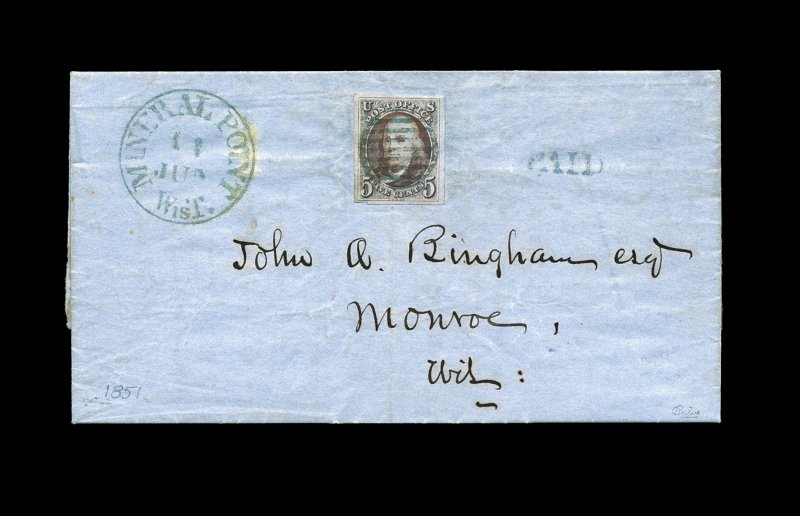 1010 c 1 #1, 5c Red brown, very large margins all around, especially rich color, wonderfully postmarked on an 1851 folded letter to Monroe, Wis. by bold central strike of a greenish blue grid, with matching "Paid" to right and superb "Mineral Point, WisT./11 Jun" c.d.s. to left, a post-territorial use of an old territorial designation, couple of trivial bleached spots in lettersheet, stamp has been lifted for examination and hinged in place, overall an extremely fine and lovely cover; a desirable and rare Five Cent 1847 usage from Wisconsin, with only eight Five Cent recorded usages from Mineral Point in the Alexander census; 1993 and 1998 PF certificates; ex-"Sevenoaks" collection. (Image) Est. 4,000-5,000
