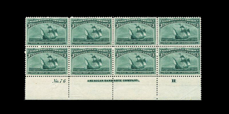 1213 ogPB 232 #232, 3c Columbian, showpiece full bottom margin imprint, letter "R" and plate "No. 76" block of eight, in a remarkable state of preservation, with incredibly rich color and a sharp impression, each stamp being wonderfully well centered, pristine o.g., stamps n.h., lightly hinged in ungummed portion of the sheet selvage only, extremely fine; we cannot recall ever having seen a finer Three Cent Columbian plate block; 1992 PF certificate; ex-Anderson. (Image) 1,200.00