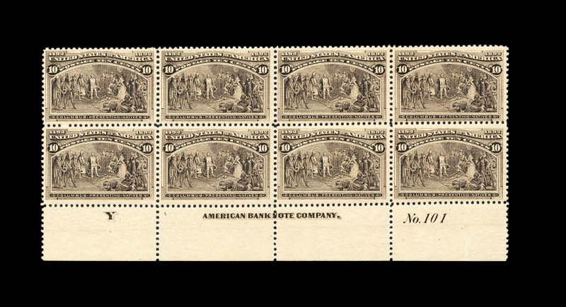 1224 ogPB 237 #237, 10c Columbian, a striking full bottom margin imprint, letter "Y" and plate "No. 101" block of eight, being one of the finest Ten Cent Columbian plate blocks we have ever offered, possessing qualities seldom seen on higher value Columbian plates, featuring the more desirable darker shade and a razor-sharp impression, extraordinarily well centered, strong and intact perforations, o.g., very lightly hinged on the top stamps only, bottom row n.h., extremely fine for this rare plate block; 1992 PF certificate; ex-Anderson. (Image) 5,000.00