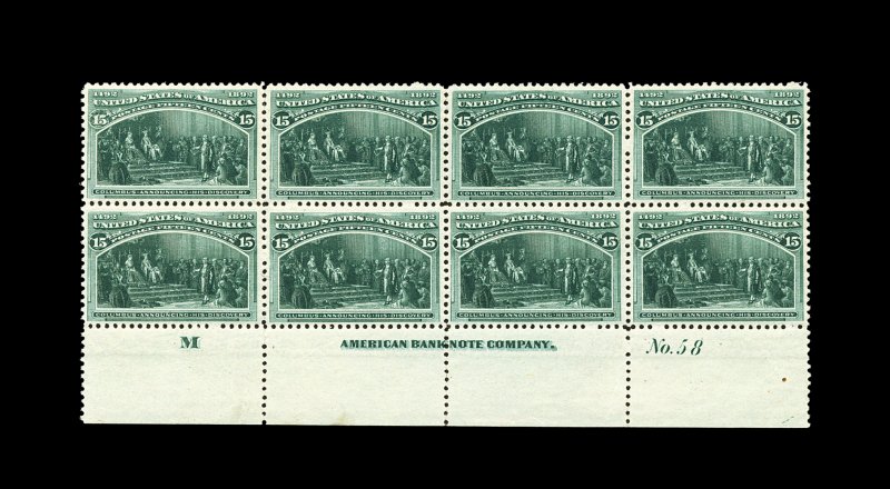 1225 nhPB 238 #238, 15c Columbian, a most impressive full bottom margin imprint, letter "M" and plate "No. 58" block of eight, incredibly fresh and choice, deep luxuriant color and a crisp impression, exceptionally well centered throughout the plate, strong and intact perforations, unblemished o.g., never hinged, small tear in the bottom left sheet selvage, nevertheless an extremely fine example of this plate block rarity, being one of the finest Fifteen Cent Columbian plate blocks of eight we can find recorded; 1992 PF certificate; ex-Anderson. (Image) 11,000.00
