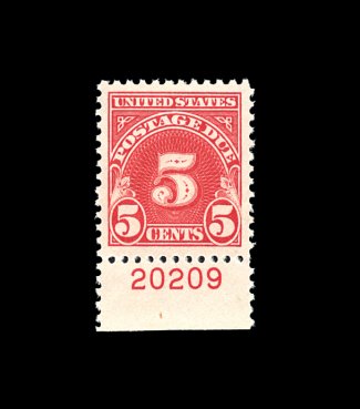 1605 nh J78 image#J78, $5.00 Carmine, bottom plate no. 20158 single, perfectly centered, brilliantly fresh, pristine o.g., n.h., extremely fine; 1984 PF certificate. (Image) 60.00