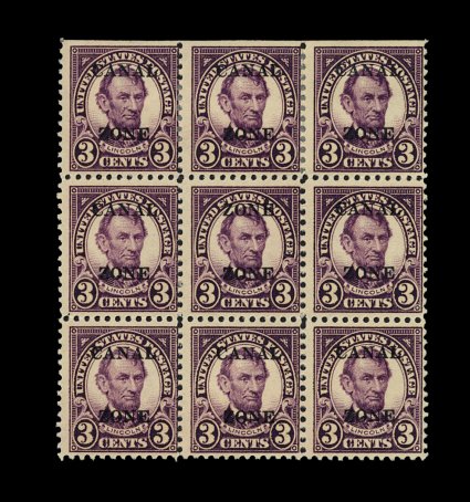 1781 ogbl 85a #85a, 3c Violet, "Zone Zone" error, being the center stamp in a block of nine, deep intense color, usual centering for this, slightly tropicalized o.g., fine; a scarce error. (Image) 600.00