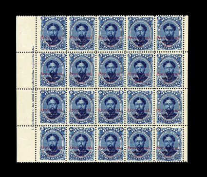 1848 nhbl 58 #58, 5c Deep indigo Provisional Govt. issue, mint block of twenty (5x4), with selvages on both sides including a full imprint at left, incredibly deep color and a prooflike impression, pristine o.g., never hinged, a very fine and striking block. (Image) for hinged 240.00+