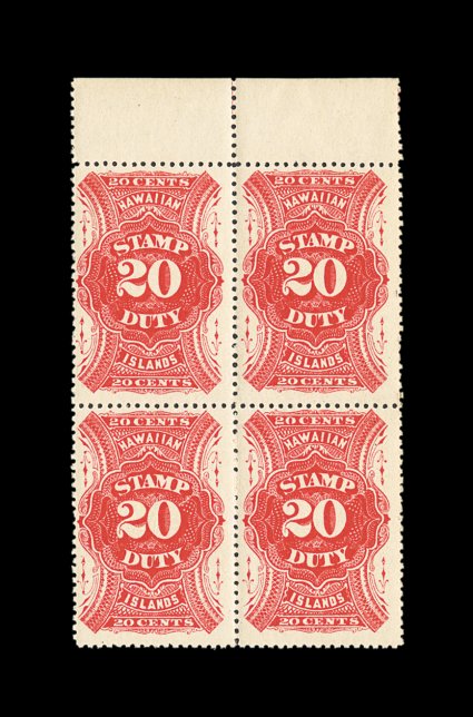 1860 nhbl R9 #R9, 20c Red revenue, pristine top sheet-margin block of four, brilliantly fresh, o.g., never hinged (right stamps with faint black offset on gum), very fine and handsome. (Image) for hinged 700.00+