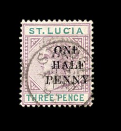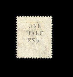 2201 O 40d #40d, 1892 "One Half Penny" surcharge on 3p Lilac and green, triple surcharge, one on back, all three surcharges quite clear, fresh, c.d.s. postmark, very fine; an extremely rare variety of which only a few are known (all used); 1985 BPA certificate (S.G. #56 var.). (image 2201a) (image 2201b) 1,500.00