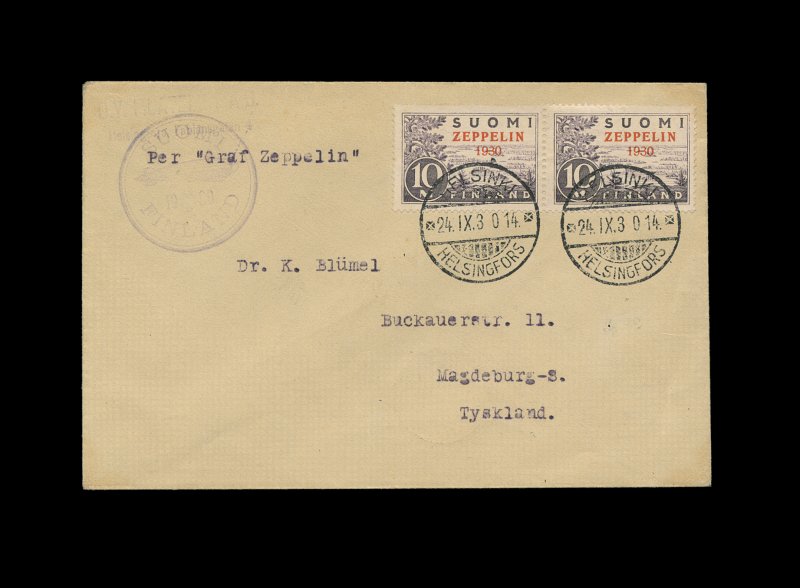 2383 c Sieger #89B Sieger #89B, 1930 Baltic Sea Flight, beautifully centered horizontal pair of 10M "Zeppelin/1930" overprints (#C1), very neatly tied to cover by two exceptionally clear strikes of "Helsinki/24. IX. 30" bilingual c.d.s., small Friedrichshafen arrival c.d.s., then backstamped Magdeburg, violet flight cachet, extremely fine (Sieger €675). (Image) Est. 300-400