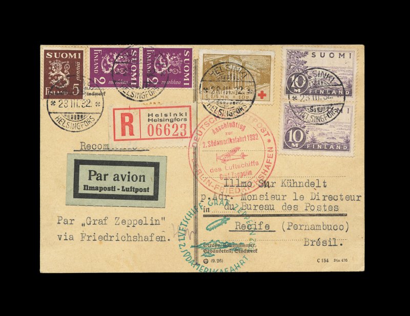 2388 c Sieger #143B Sieger #143B, 1932 Second South American Flight, flown registered card to Brazil with 10M Gray lilac vertical pair (#178), along with four other adhesives to pay registry fee, all tied by "Helsinki/23.III.32" bilingual c.d.s., green flight cachet and red Berlin connecting flight cachet, backstamped Pernambuco, very fine (Sieger €700). (Image) Est. 300-400