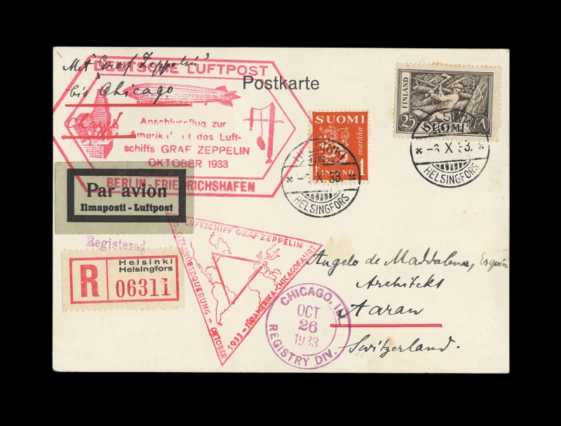 2390 c Sieger #238E Sieger #238E, 1933 Chicago Flight, 25M Black brown high value (#279) along with one other adhesive, tied to very clean and neat registered card by "Helsinki/6.X.32" bilingual c.d.s., flown to Friedrichshafen to Chicago leg with Chicago registry division receiving c.d.s. on the front, forwarded on by ordinary mail via New York to Switzerland, red flight and large attractive Berlin connecting flight cachet, extremely fine; ex-Belinkoff (Sieger €500). (Image) Est. 300-400