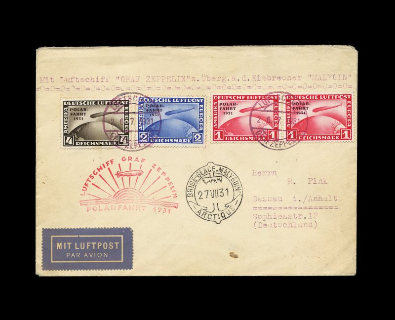 2464 c C40-42 #C40-42, 1931 1M-3M Polar Flight Zeppelins cplt., with additional 1M value, all tied by 6.7.1931 Zeppelin c.d.s cancels on flown Polar Flight cover, with red cachet and Malyguin handstamp, very fine; scarce on one cover; the catalog value just as used stamps is $960.00 (Michel #456-58). (Image) Est. 400-500