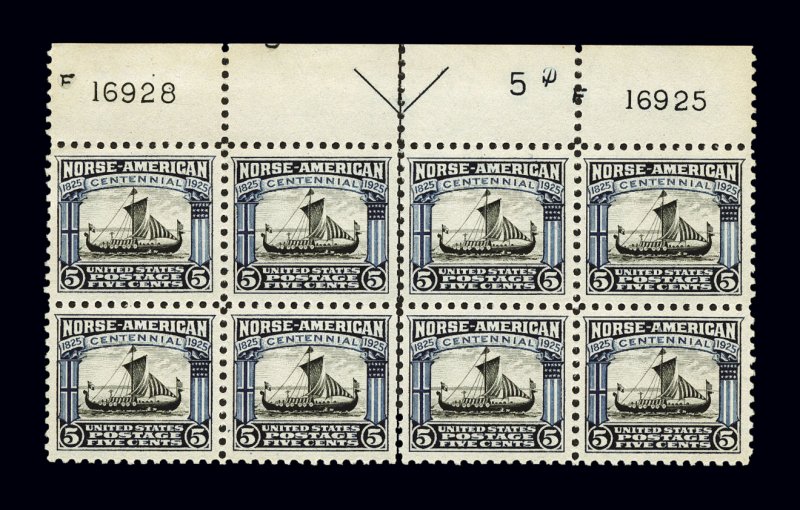 962 nhbl 621 image#621, 5c Norse-American, an unusually select full top margin arrow and plate nos. F16928, F16925 block of eight, with exceptionally large top selvage for this issue, intense colors, very well centered and margined, without the often seen selvage indentation at top (caused during production), o.g., n.h., extremely fine. (imagea) (Image) $700.00