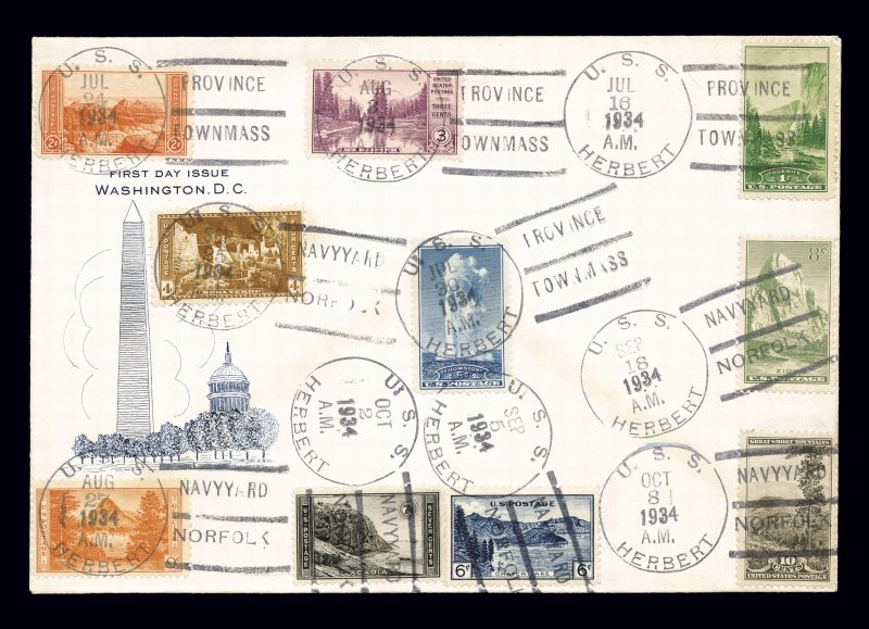 971 FDC 740-49 image#740-49, 1c-10c Parks cplt., set on one Grimsland cacheted first day cover, cancelled by U.S.S. Herbert dupex pmks., a most unusual cover in that each stamp is cancelled by its own first day (all ten had different first days of issue), faint toning band, very fine; an excellent cover for the Parks specialist. (imagea) (Image) Est. 300-400