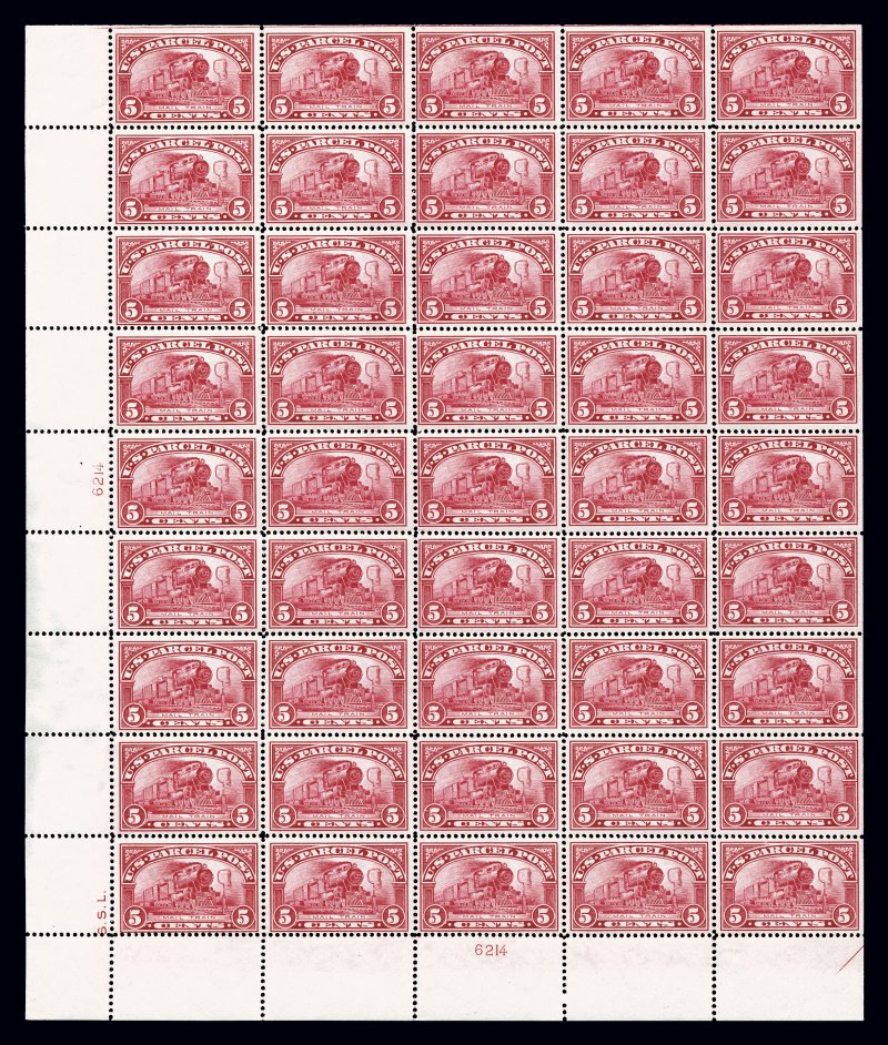 1202 nhbl Q5 image#Q5, 5c Parcel Post, bottom left pane plate no. 6214 pane of 50, radiant rich color, o.g., n.h., fine-very fine; a very scarce and seldom offered pane. (imagea) (Image) $6,620.00+