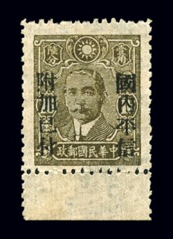 1678 og 526(p) image#526(p), 1942 Hupeh red Domestic Paid surcharge on 16c Dull olive brown, perf, 10 1/2-11 1/2, unused, without gum as issued, marvelously well centered example of this very rare province's surcharge, full even perforations all around which is difficult to find on this widely spaced perforation guage, extremely fine; an incredibly difficult stamp to acquire (Chan #631b; $950.00). (Image) $825.00