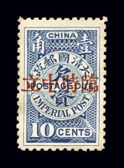 1691 ng Chan #DU1 imageChan #DU1, 1911 1/2c Brown postage due, unissued value, unused, without gum, beautifully centered, brilliant orange brown color, extremely fine and exceptionally rare; in 1911 a new order was made with Waterlow for six values of postage dues with the instruction to change the color from blue to brown, the 1c and 2c values in brown arrived first and were issued, the 1/2c, 4c, 5c and 20c did not arrive until after the Manchu government had been overthrown and the Republic instituted, these four values were immediately issued with Republic of China overprints, only a very few unoverprinted stamps found their way into collectors' hands making them exceedingly elusive and seldom offered; listed but not priced in Chan, not listed in Scott but mentioned in a footnote after #J16. (Image) Est. 400-500