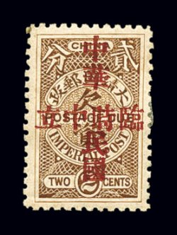 1693 og Chan #DU4 imageChan #DU4, 1911 20c Brown postage due, unissued value, mint single of this value that was never placed in use without the Republic of China overprints, quite well centered, attractive bright color, o.g. with h.r. and slight adherence, couple of trivial gum soaked perfs. at right, otherwise very fine for this rare stamp; listed but not priced in Chan, not listed in Scott but mentioned in a footnote after #J16. (Image) Est. 400-500