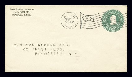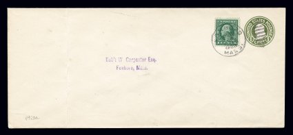162 c U379/398 image1903-1904 Hartford postal envelope specialized collection of earliest documented usages consisting of seventeen entires and two fronts (#U379/398), one front is especially important being a 2c Carmine on white (#U385; UPSS #1398-13-78-14) cancelled with a Vicksburg, Mich. duplex dated March 18, 1903, the earliest documented usage of any envelope manufactured by the Hartford Manufacturing Co., this plus six other envelopes are the earliest documented usages for Scott #'s U379, U380, U381, U383, U385, U391 and U398, a Scott number earliest documented usage is for that denomination on that color or type of paper regardless of size, knife or watermark (as well as being the earliest documented usage for their specific UPSS number), the 1c Green on oriental buff is of particular interest because it is the April 10, 1903 earliest documented usage for any 1c envelope; the other eleven covers and a front are the earliest documented usages for specific UPSS numbers, which are all differentiated in the UPSS specialized listings, included in that group are six very scarce and mostly newly listed watermark 14 varieties of "03" and "903" in the dates instead of "1903" as is normal, these varieties apparently occurred late in the Hartford issue production, one of which is dated in the year 1906 and the other five all in 1907, these are all scarce in their own right and given considerable premium value over the normal but even so the UPSS price is absurdly low, almost always bringing multiples of catalog value in whatever venue they appear, let alone as the earliest documented usages, these include the particularly elusive 1c Green on white with watermark "903" (UPSS #1377c-10-57-14 var.), newly listed and the only 1c envelope yet discovered with this watermark variety, others are 2c Carmine on white with watermark "03" (UPSS #1442c-10-57-14), plus two different 2c Carmine on amber and two different 2c Carmine on buff, all four newly listed and undervalued with watermark "903" (UPSS #'s 1453a-10-57-14 var., 1457a-23-106-14 var., 1463a-13-78-14 var., 1464a-21-100-14 var.), several foreign usages are also noted, overall condition is fine-very fine with most being very fine; a marvelous collection of all earliest documented usages of this popular envelope series and a must for anyone building a specialized collection of these issues; each accompanied by a 2002-2005 APS certificate. (imagea) (imageb) (Image) Est. 2,000-3,000