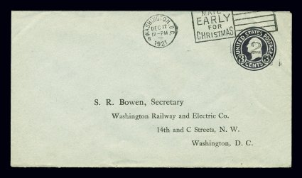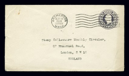 163 c U400/419 image1907-1916 Mercantile Oval Die postal envelope collection of earliest documented usages, a rather extensive collection of this company's postal stationery consisting of a total of 66 different (#U400/419), 26 of these are the earliest documented usage of Scott numbers which distinguishes the envelopes by denomination, color, die and color or type of paper, but not by size, knife or watermark as the UPSS catalog further delineates in there specialized listing, the collection breaks down by denomination to include ten of the 1c value, five of which are Scott number earliest documented usages including an interesting unsealed circular usage to Belgium without additional franking, cancelled by Chicago, Ill. machine cancel dated October 23, 1907, the earliest documented usage of any 1c Mercantile envelope (#U400; UPSS #1478-10-57-15), the 2c value has an impressive collection of 43 different envelopes and one front, five being the scarcer Brown red color used early in production, the cover front is exceptionally important being 2c Brown red on white, die 1, with a full South Sharon, Pa duplex dated July 11, 1907, the earliest documented usage of any Mercantile value, being used only eleven days after the contract started with Mercantile Corporation on July 1st, included in the 2c envelopes are several scarce types in their own right including the scarce die 7 on 2c Carmine on amber and on blue(#U412f, U414f; UPSS #1845-11-65-20, 1947-10-59-19), both earliest documented usages for those Scott numbers, also scarce die 8 on 2c Carmine on blue (#U414f; UPSS #1950-13-80-19), other values include three 4c Black (two are earliest documented usages of Scott numbers) and nine 5c Blue (three earliest documented usages of Scott numbers), the 5c values are all foreign usages and include rare UPSS varieties as 5c Blue on white vertically laid paper (UPSS #1985-8-41-15A) and on wove paper (UPSS #1989-10-59-19), condition is fine-very fine or better, an exceptional collection of this issue all being earliest documented usages of either the Scott numbers or UPSS numbers; accompanied by a 2003-2005 APS certificate for each item in the collection. (imagea) (imageb) (Image) Est. 5,000-7,500