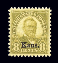 810 nh 666 image#666, 8c "Kans." ovpt., a stunning mint copy, featuring flawless centering within exceptionally large margins, radiant color on pristine paper, immaculate o.g., n.h., extremely fine; a true gem example of this difficult and key value; 2005 PSE certificate (XF-Superb 95). (Image) $180.00