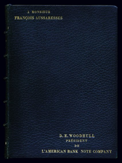 1002 P 230P-45P image#230P1-45P1, 1c-$5.00 Columbians, Columbian Exposition presentation album of hybrid die proofs on India cplt., presented to the French Ambassador to the United States from the President of the American Bank Note Company, a specially bound leather album with full dark blue morocco binding, page edges are gold gilded with each page being a large die hybrid proof for the sixteen values, unlike other die proofs, the proofs are oriented in vertical format on the pages which measure 152x227mm with each proof being die sunk, inscribed entirely in French throughout with gold stamping on the binding reading "Christophe Colomb/1492-1892" on the spine and "A Monsieur/Francois Aussaressess" and "D.E. Woodhull/President de L'American Bank Note Company" on the front cover, includes a title presentation page and each proof is preceded by a page naming the value, slight opening cracks to the spine, quite usual for old leather, a very fine and beautiful book; believed to be one of only five such books produced, this one in French being unique; accompanied by original dust case. (imagea) (Image) Est. 4,000-5,000