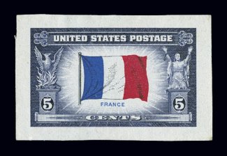 1267 909P2-21P2 image#909P2-21P2, 1943-44 5c Overrun Countries, small die proofs on wove paper cplt., produced by the American Bank Note Co., the printer of this issue, this is the same course wove paper showing a slight mesh as is found on the large die proofs, all measuring approximately 41x26mm being very similar in appearance to the Bureau small die proofs of this period, five proofs with light and very minor thins, very fine set; exceptionally rare and unlisted in Scott; the only set that we have ever encountered and quite possibly the only small die proofs in private hands. (imagea) (Image) Est. 4,000-5,000