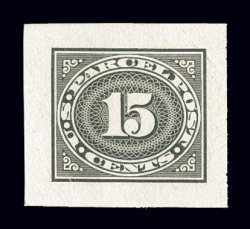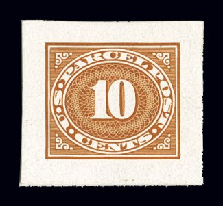 1487 P Q10P1 image#Q10P1, 50c Parcel Post, large die proof on India, die sunk on full size card measuring 201x153mm with untrimmed India proof paper, an exceptionally rare engraver's proof, on the reverse is penciled "Baldwin", the vignette engraver, overall quite fresh with only some light stains at the very corners of the India, very fine and exceptionally choice; we are aware of no other large die proof of this value in private hands, other than the one on wove paper in the President F.D. Roosevelt set; C.A. Huston, designer; M.M. Baldwin, vignette engraver; control number 570609 (1913). (Image) $1,400.00