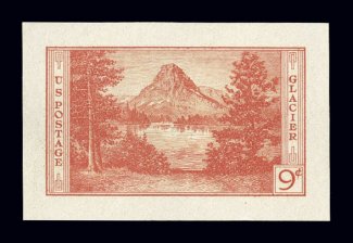 1167 P 740P1a image#740P1a, 1c National Parks, large die proof on wove paper, die sunk on large card measuring 120x153mm, showing the full die sinkage, very fresh and attractive, extremely fine; only the 1c, 3c, 7c and 9c values from this popular series are listed in large die proofs in Scott (for 3c and 7c see lots 1168 and 1171), an extremely rare proof and quite likely the only one known in public hands; V.S. McCloskey, designer; J.C. Benzing, vignette engraver. (Image) $800.00
