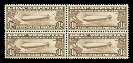 719 og/nhbl C13-15 image#C13-15, 65c-$2.60 Graf Zeppelins cplt. in blocks of four, each exceptionally well centered and with strong fresh colors, all with o.g., all four stamps in 65c block n.h., $1.30 is very lightly hinged on one stamp only, the others are n.h., all four stamps with light natural flat plate gum creases or wrinkles, and the $2.60 is lightly hinged in the top pair, bottom pair is n.h., overall a very fine and handsome set of blocks. (imagea) (imageb) (Image) $8,050.00