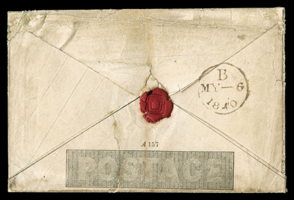 67 c imageMay 6, 1840, 1p envelope, A157, used from London to Hastings, deep red Maltese Cross cancel at top center, clear "B/MY-6/1840" black London datestamp on reverse, while markings are quite choice, the envelope itself is worn and has the usual faults associated with the frail Mulready paper, nevertheless it still remains exhibition worthy; ex-Shaida. (imagea) (Image) Est. $2,000-3,000