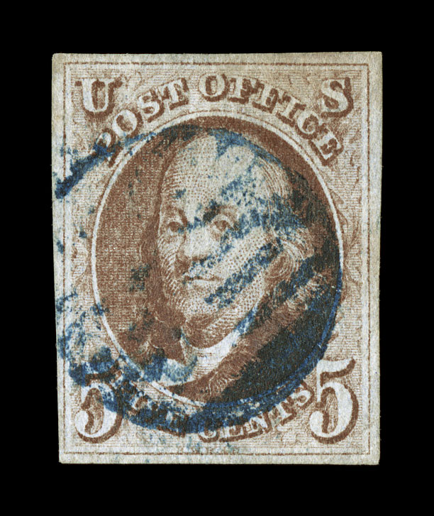 SMQ $710.00).#1, 5c Red brown, used, large even margins all around, rich color and a fine impression, red grid cancels, extremely fine; 1998 and 2004 PSE certificates (latter grading VF-XF 85; SMQ $710.00). (Image) $600.00