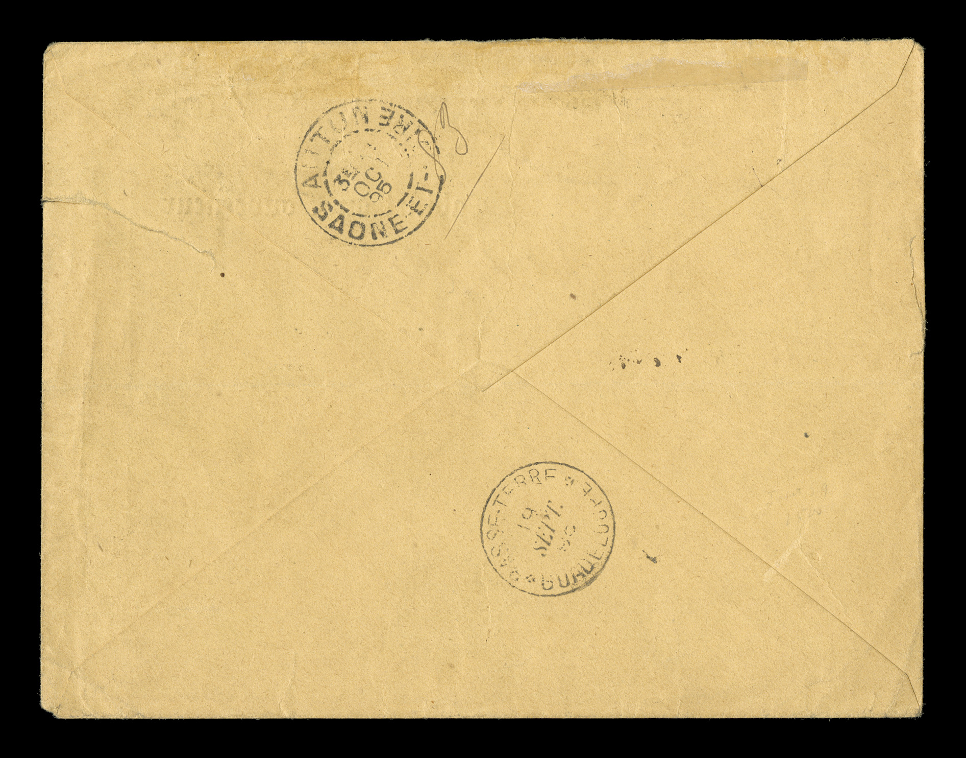 imprinted cover of the Office of the Governor of Guadeloupe, tied by liYvert #26, 1891 1Fr Olive with provisional "Guadeloupe" overprint, right sheet margin horizontal pair, attractive and fresh, an exceptionally rare high value franking on 1895 imprinted cover of the Office of the Governor of Guadeloupe, tied by light strike of rare "Saint Claude/Guadeloupe/19 Sept. 95" double-circle c.d.s. with additional strike at right, "R" boxed registry handstamp, Basse Terre transit on the reverse, backstamped Autun, cover opened irregularly causing a tear at top right but intact, otherwise very fine; this unusually high value franking pays seven times the U.P.U. foreign mail rate plus 25c registry fee; a rare value on cover from a small village. (imagea) (Image) Est. $400-500