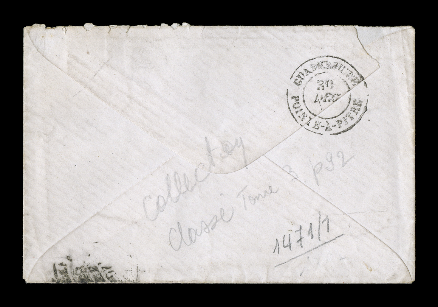of the island of Basse Terre, stamp tied by black GuadeloupeCFrench Colonies Yvert #41, 1879 15c Blue, Ty. II, single with well clear to large margins on another small 1885 cover to Pointe-a-Pitre from Capesterre located on the east coast of the island of Basse Terre, stamp tied by black "Guadeloupe/Capesterre(G.P)/7 Juin 85" double-circle c.d.s. with similar strike at left, backflap missing and repaired corner to cover, not affecting the stamp or markings, fine; the "G.P" designation in the cancel was inserted to differentiate this village from the town of the same name on the island of Marie Galante; very rare with very few examples known to exist. (imagea) (Image) Est. $750-1,000