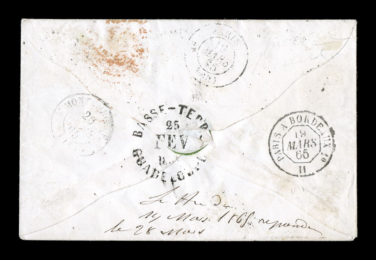 mostly clear to large margins on both multiples, tied to small coFrench Colonies Yvert #3, 1859 10c Yellow bister horizontal strip of three and pair, an absolutely beautiful French packet cover to France from the small village of Capesterre, mostly clear to large margins on both multiples, tied to small cover by neat strikes of a delicate 7x7 point black lozenge cancel, equally well struck black "Capesterre/(Guadeloupe)/24 Fev 1865" large rimless c.d.s., similar rimless transit of Basse Terre across letter join on the reverse, on the front both the red boxed "PD" and St. Nazaire entry transit tie the stamps as well, various French transits and backstamped Montambau, extremely fine in all regards; a marvelously rare cover not only for its unusually choice quality with attractive franking and exceptionally well applied markings, but also being a very early and rare posting from this tiny town; ex-Dubus. (imagea) (Image) Est. $4,000-5,000