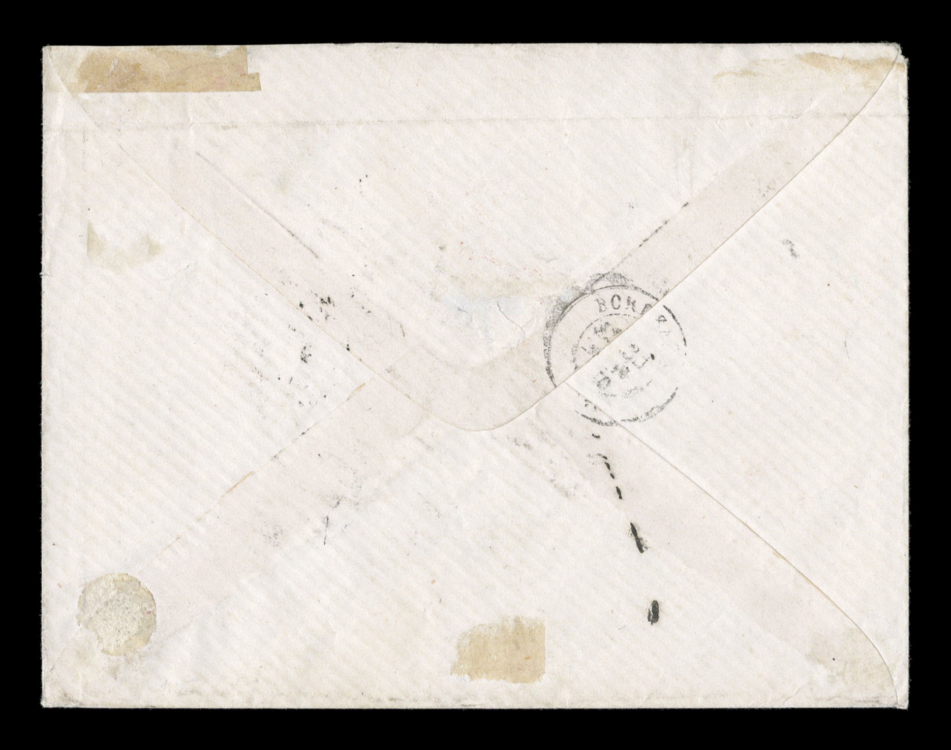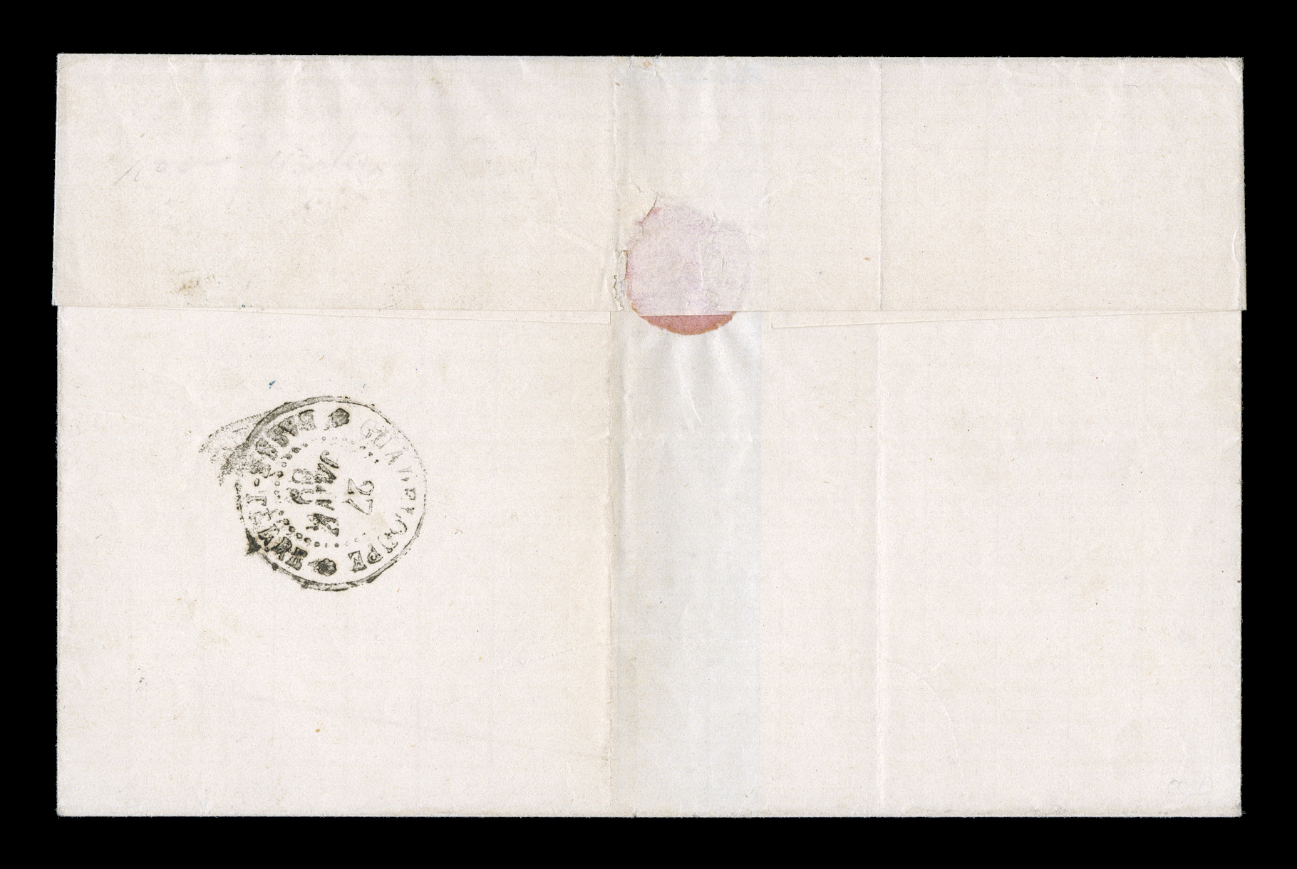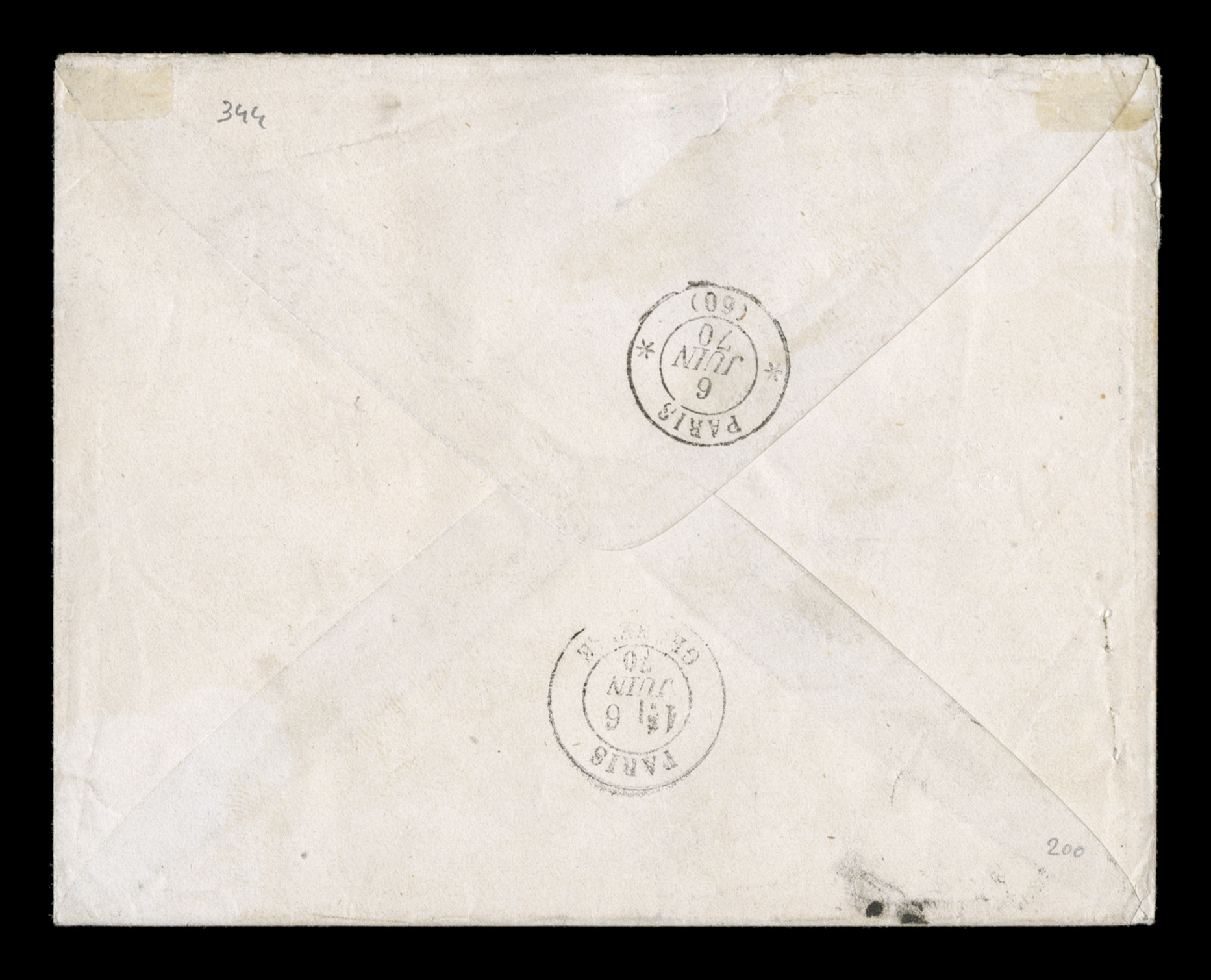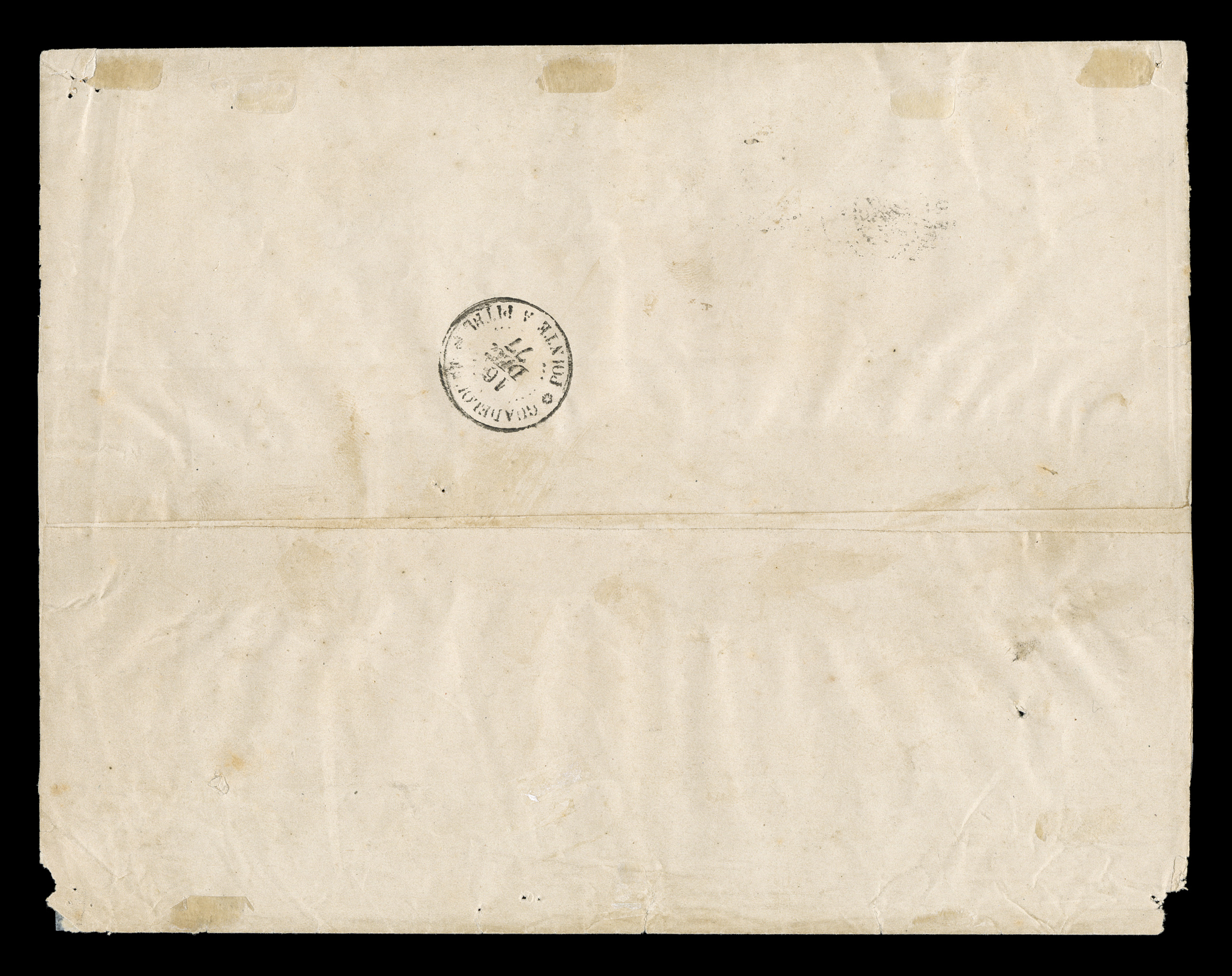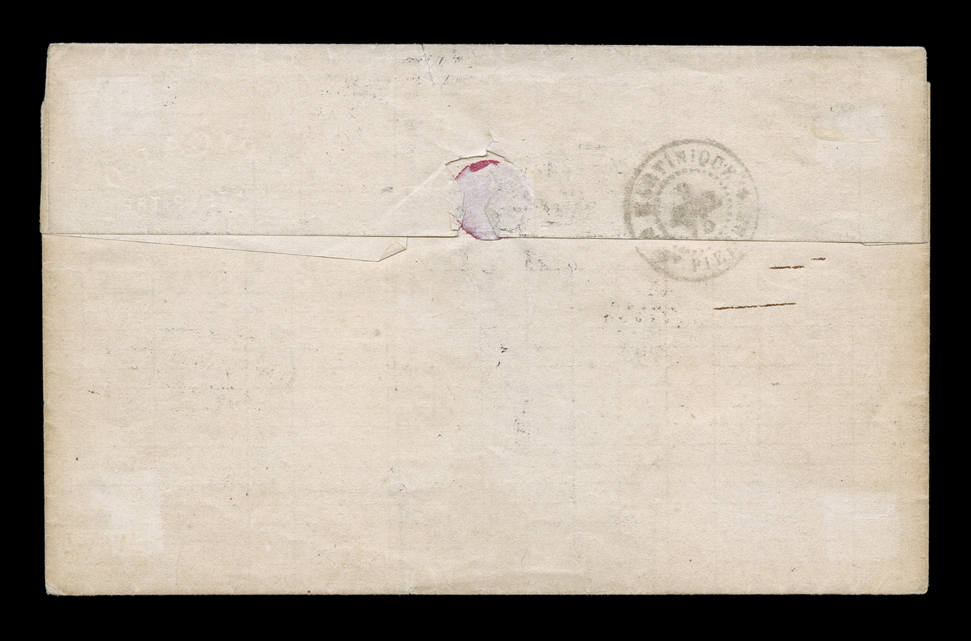 quadruple 80c domestic rate on the first leg of this cover from PointeFrench Colonies Yvert #5, 1859 40c Vermilion vertical pair, exceptionally choice with large to extra-large margins, tied to an amazingly rare turned linen cover paying the quadruple 80c domestic rate on the first leg of this cover from Pointe-a-Pitre to Trois Rivieres, pair tied by black 8x8 point lozenge cancel, with matching "Pointe-a-Pitre/Guadeloupe/18 Sep 1864" rimless c.d.s. plus large red "P.P" boxed handstamp, immediately upon arrival the envelope was opened out and turned and re-posted back to Pointe-a-Pitre from the small village of Trois Rivieres, franked with a handsome 10c Bister horizontal strip of four (French Colonies Yvert #3), tied to the linen side of the cover by neat 7x7 point black lozenge cancels with full and exceptionally rare strike of "Trois-Rivieres/Guadeloupe/21 Sep 1864" rimless c.d.s., this franking paying the 40c double domestic rate, both sides are extraordinarily high quality and attractive; extremely fine; an amazing cover that is actually the listing example for the rare rimless Trois Rivieres postmark in the Dubus book, but more significant is that this is the only recorded turned cover of any of the French Colonies, and that each posting is a spectacular and rare Eagle usage just adds to the stunning affect of this cover; ex-Dubus. (imagea) (Image) Est. $7,500-10,000