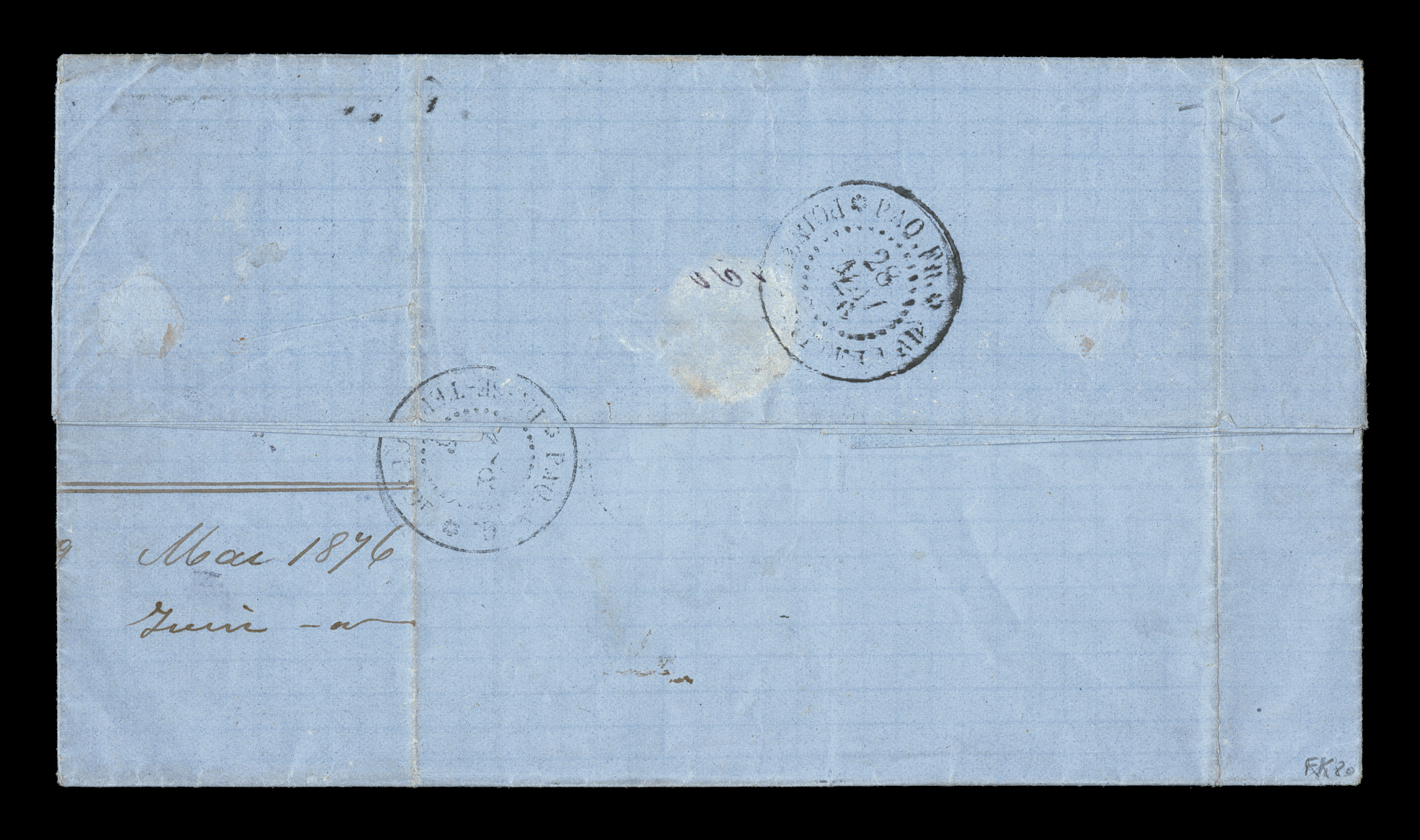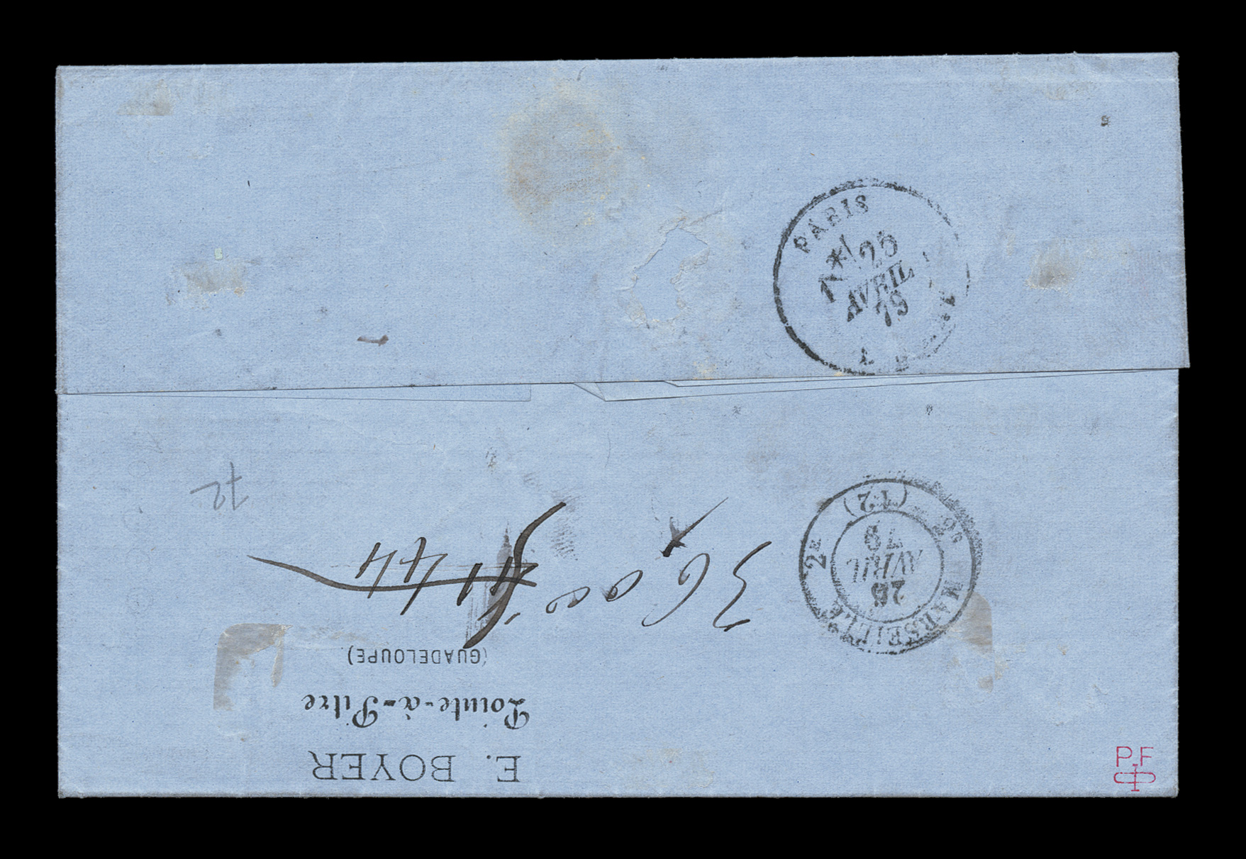 entire folded letter to France by Paq. Fr.Pointe-a-Pitre9 Avril 79French Colonies Yvert #14, 17, 1872-73 1c Olive green on pale blue and 5c Green on blue, single and horizontal pair of the former, all with clear to large margins, tied to 1879 entire folded letter to France by "Paq. Fr./Pointe-a-Pitre/9 Avril 79" double-circle sorting cancels, this franking was intended to pay the rare 8c printed matter rate instead of the 25c U.P.U. rate though the cover was not marked printed matter and the letter is obviously regular correspondence, the cover was marked due with "T" in triangle handstamp and "42c" due in red crayon assessed being double the proper 25c less 8c paid in stamps, backstamped Paris, a handsome cover with all markings clear, very fine; whether this was a clerical mistake by a company that regularly sent out printed matter or an attempt to save on postage cost is not known, but this is an interesting and highly unusual postage due cover of which the collector reported that this was one of the most remarkable due letters that he has seen. (imagea) (Image) Est. $3,000-4,000