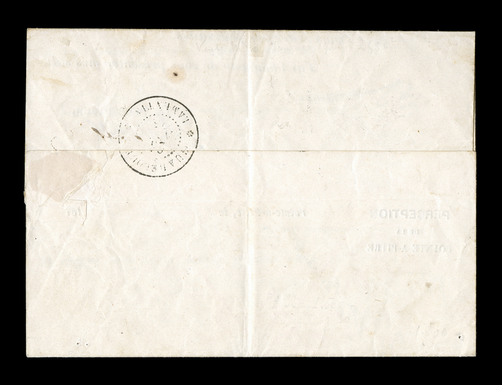 General handstamp on front with manuscript endorsement as well as1869 Basse Terre unpaid official cover, interesting sending to France via French packet with black "Guadeloupe/Basse-Terre/9 Dec." double-circle c.d.s. without year date, Procureur General handstamp on front with manuscript endorsement as well as official cachet on reverse, applied apparently in an attempt to invoke government franchise for the sending, however this was not recognized by France and the normal 60c due for an unpaid British packet cover was charged, edge wear causing tears and spindle holes, backstamped Angers, fine and unusual usage. (imagea) (Image) Est. $400-500