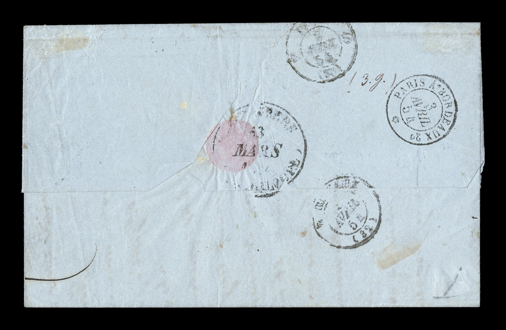over letter seal on the reverse, bold 12 rate handstamp for 12 de1854 Moule unpaid stampless entire letter to France, entire letter with well struck black "Moule/Guadeloupe/11 Mars 1854" double-circle c.d.s., similar Basse Terre transit c.d.s. over letter seal on the reverse, bold "12" rate handstamp for 12 decimes due, via British packet with red entry transit, backstamped Bordeaux, very fine; rated scarcity 5 by Jamet with only a few examples known. (imagea) (Image) Est. $400-500