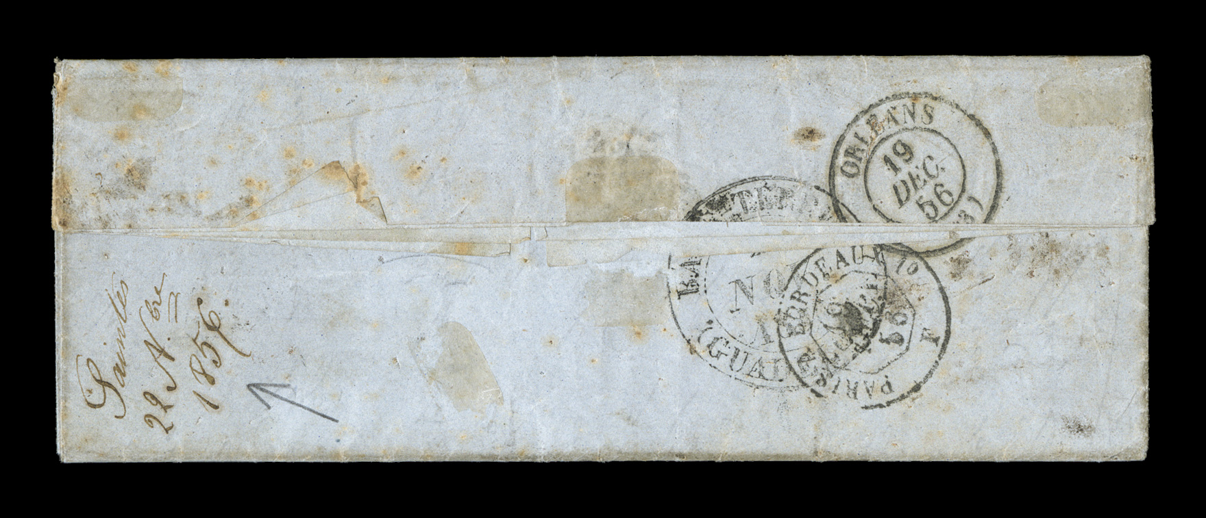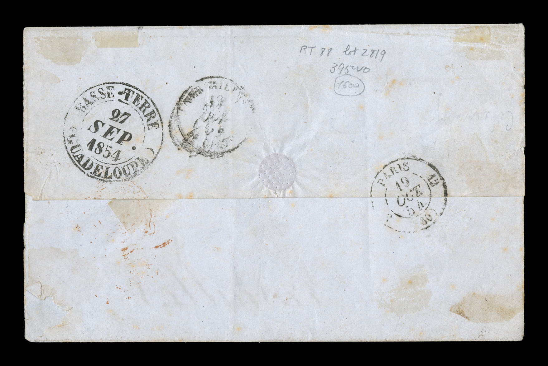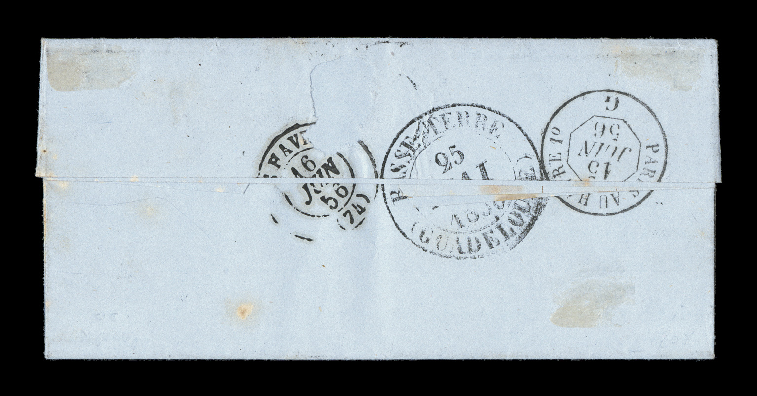 Terre transit c.d.s. on the reverse, 12 rate handstamp for 12 de1856 Les Saintes unpaid stampless entire letter to France, extremely rare entire letter with unique black "Les Saintes/Guadeloupe/25 Nov. 1856" double-circle c.d.s., similar Basse Terre transit c.d.s. on the reverse, "12" rate handstamp for 12 decimes due, via British packet with black Calais entry transit c.d.s., backstamped Orleans, a few tone specks of little significance given the rarity of this letter, very fine; Les Saintes is one of the smallest inhabited islands directly south of the large island of Basse Terre, this cover is the discovery example of this marking and is the only recorded cover; illustrated in Jamet and rated scarcity 7 indicating the only known example. (imagea) (Image) Est. $1,500-2,000