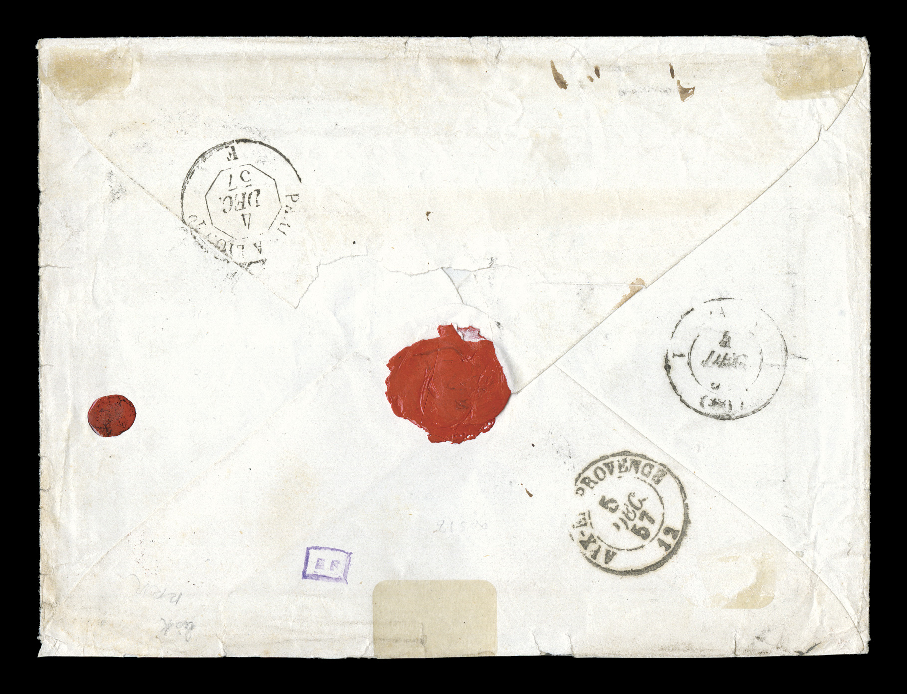 just south of Pointe-a-Pitre on Grande Terre, this being th1857 Gosier unpaid stampless cover to France, triple rate envelope with black "Gozier/Guadeloupe/11 Nov. 1857" rimless c.d.s. (spelled with a "z" rather than an "s") of this tiny village just south of Pointe-a-Pitre on Grande Terre, this being the discovery example of this marking, small size double circle transit c.d.s. of Pointe-a-Pitre, via British packet with black entry transit c.d.s., backstamped Aix et Provence, ms. "18" marking for the three times 6 decime unpaid rate, edge wear with small tears from large enclosure (a portion of the enclosure is included), a fine and exceptionally rare cover; Jamet lists this specific cover and gives it a scarcity rating of 7 indicating only one example recorded; however adding to the rarity is also the extraordinarily rare triple rate for which no rate handstamp was available; ex-Dubus. (imagea) (Image) Est. $1,500-2,000