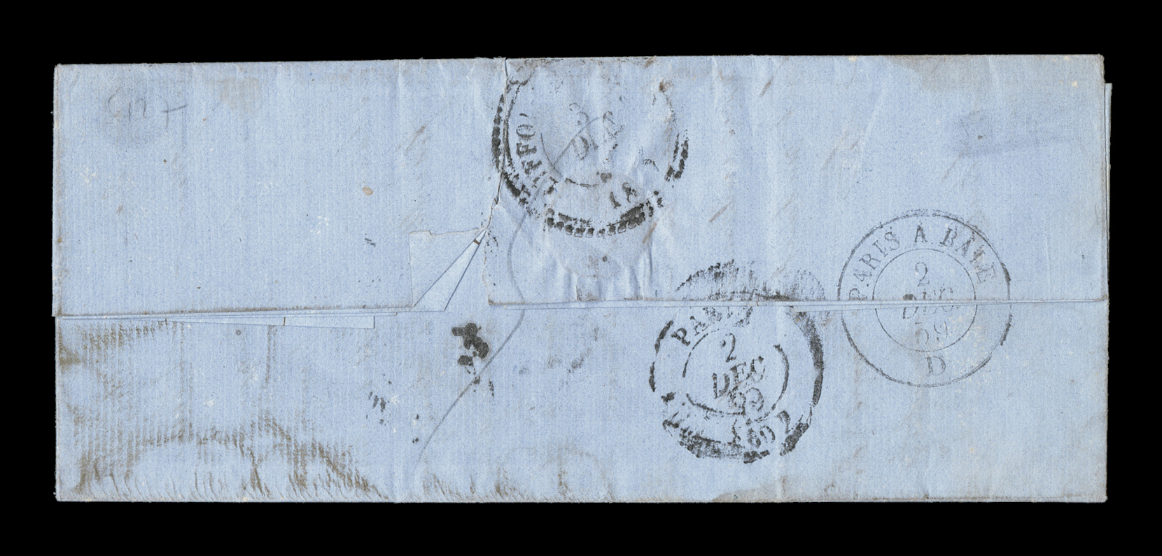 29 c 1859 Petit Canal paid stampless entire letter to France, small entire folded letter with excellent strike of the exceedingly rare blue Petit-CanalGuadeloupe10 Nov. 1859 rimless