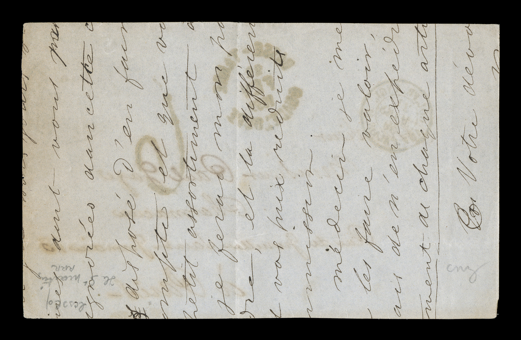 on the reverse, pre-paid at the 50c rate with black P.P hand1859 Morne-a-l'Eau paid stampless cover to France, black "Morne-a-l'Eau/Guadeloupe/26 Juil 1859" rimless c.d.s. on attractive cover to Le Havre, additional strike across envelope seal on the reverse, pre-paid at the 50c rate with black "P.P" handstamp and red boxed "PD", via British packet with Le Havre entry transit, choice very fine and a lovely cover; a rare town marking with a Jamet scarcity rating of 5 being one of only a few examples known, and especially rare as a pre-paid cover as they are distinctly in the minority compared to the unpaid; ex-Dubus. (imagea) (Image) Est. $750-1,000