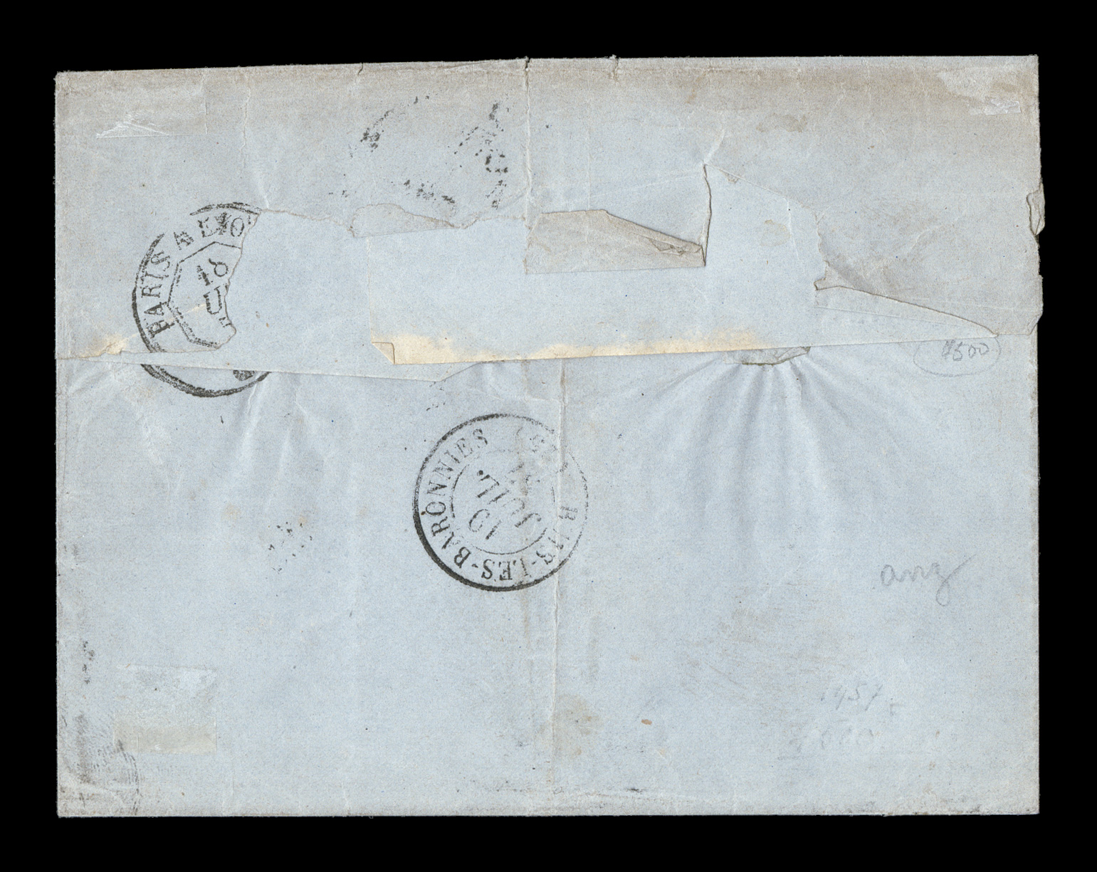 rimless c.d.s., Basse Terre transit c.d.s. on the reverse, 6 rat1858 Anse Bertrand unpaid stampless cover to France, attractive petite blue envelope with a discernible strike of the exceedingly rare blue "Anse-Bertrand/Guadeloupe/27 Juil 1858" rimless c.d.s., Basse Terre transit c.d.s. on the reverse, "6" rate handstamp for 6 decimes due being the new 60c unpaid rate that went into effect in 1857 and lasted until 1859 (the pre-paid rate was only 50c), via British packet with black Calais entry transit., backstamped Nantes, very fine; the small village of Anse Bertrand is located on the northern point of Grande Terre; not only is this an exceptionally attractive cover with an unusual Blue postmark but it is the only cover with this marking that has been recorded; this is the example listed by Jamet and rated scarcity 7 indicating that this is the only known example; ex-Dubus. (imagea) (Image) Est. $1,500-2,000