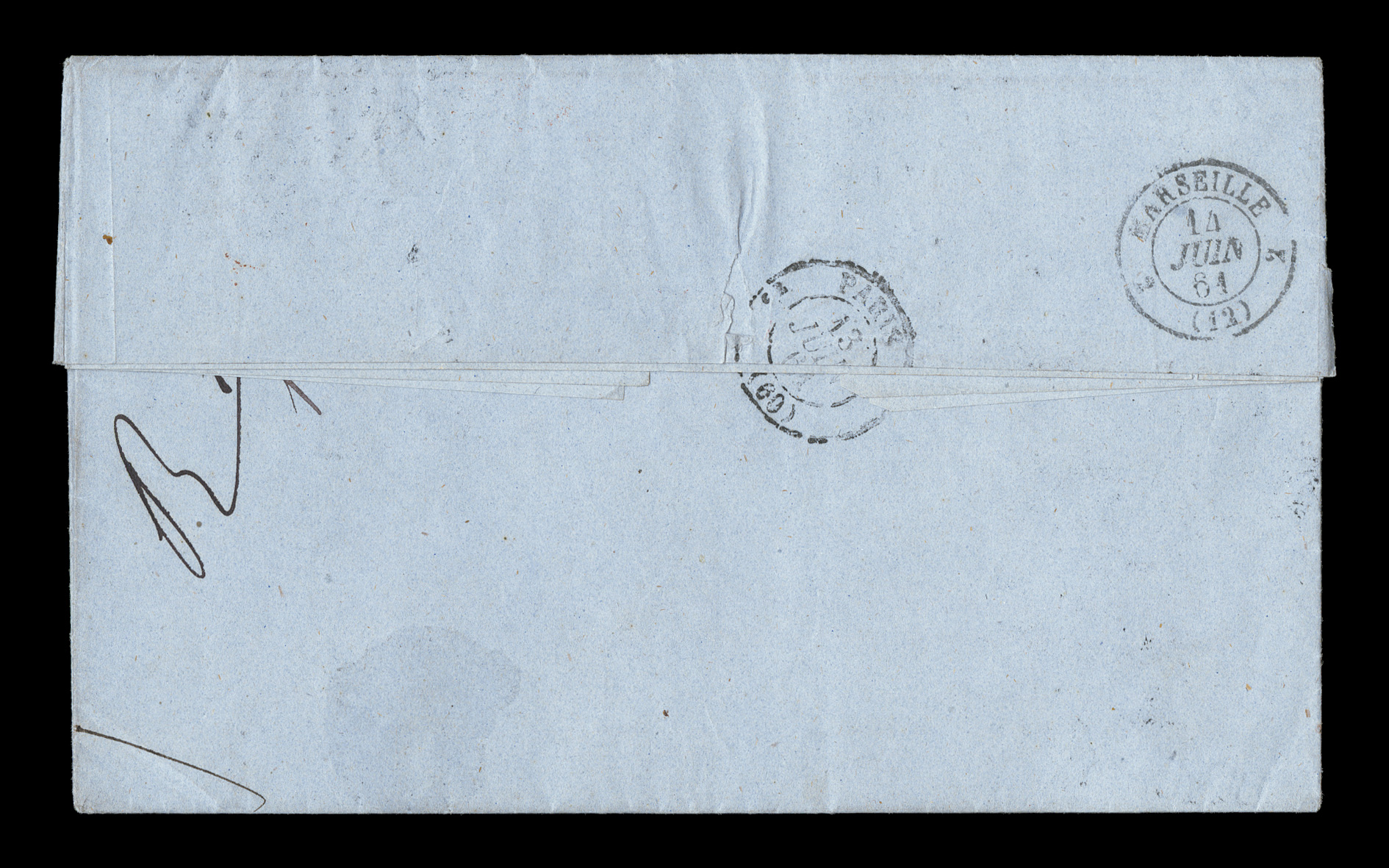 cancels, clear Pointe-a-PitreGuadeloupe25 Mai 1861 rimless c.dFrench Colonies Yvert #3, 5, 1859 10c Yellow bister and 40c Vermilion, singles of each with mostly large margins, tied to attractive 1861 entire folded letter to France by lozenge cancels, clear "Pointe-a-Pitre/Guadeloupe/25 Mai 1861" rimless c.d.s., via British packet with black Calais entry transit, boxed red "PD" handstamp, Paris transit, backstamped Marseilles, very fine and handsome single rate cover to France. (imagea) (Image) Est. $200-300